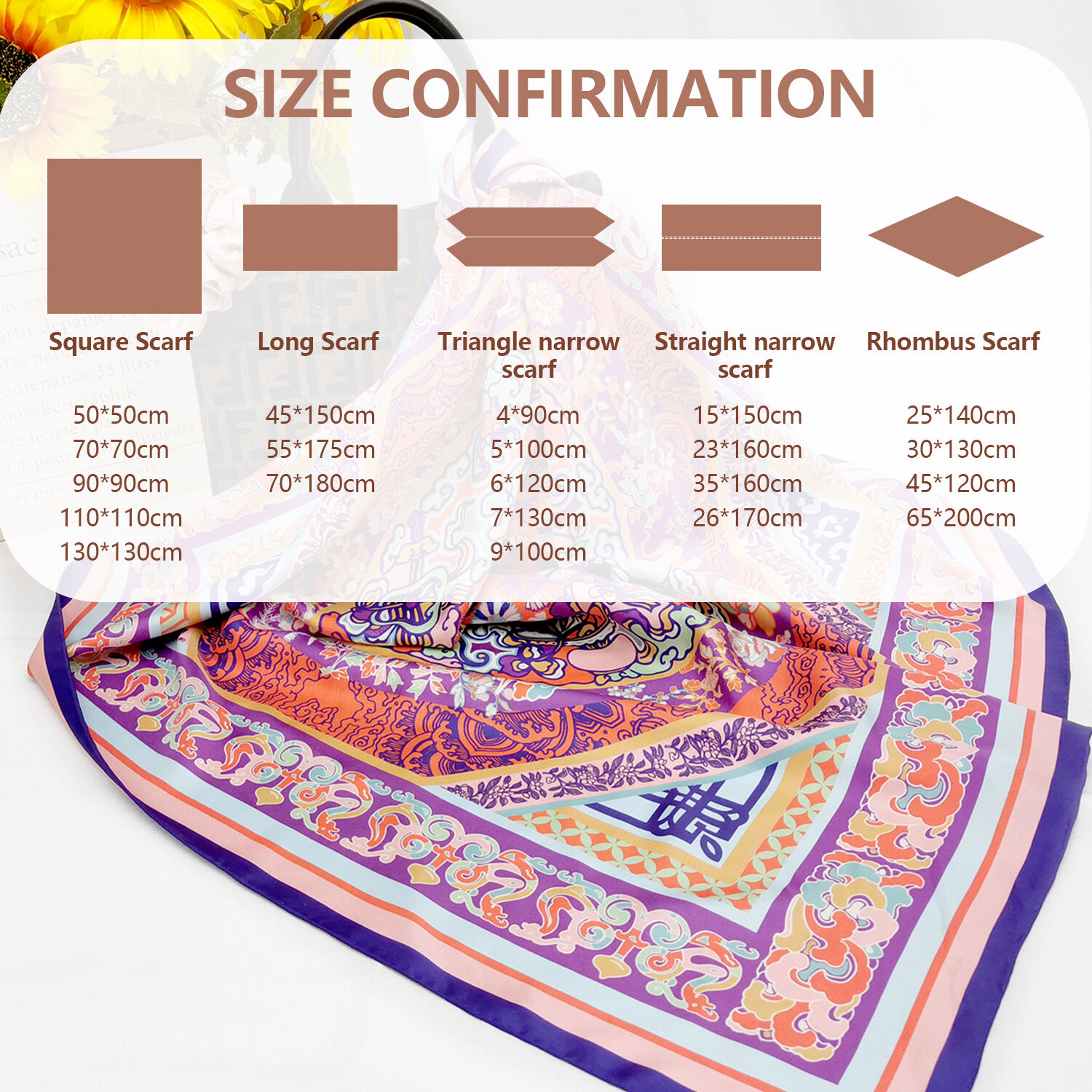 Универсальность и размеры: квадратные (90x90 см), прямоугольные (180x70 см) или узкие модели — подходят для разных способов ношения (шарф на шею, повязка на голову, резинка для волос).